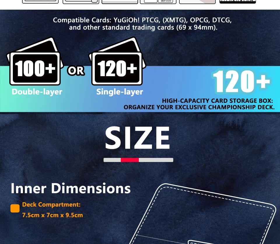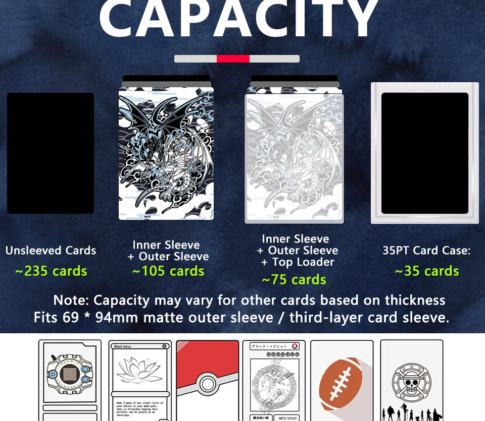 - Capacity: Holds up to 100 double-sleeved cards or 120 single-sleeved cards.