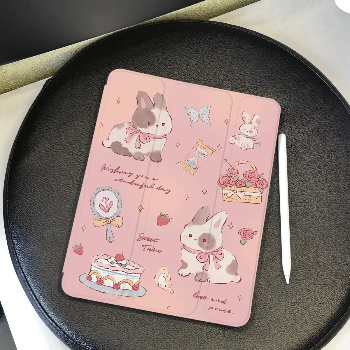This case features an adorable and whimsical design with cute illustrations of bunnies and sweet treats, making it a delightful accessory for any iPad user!
