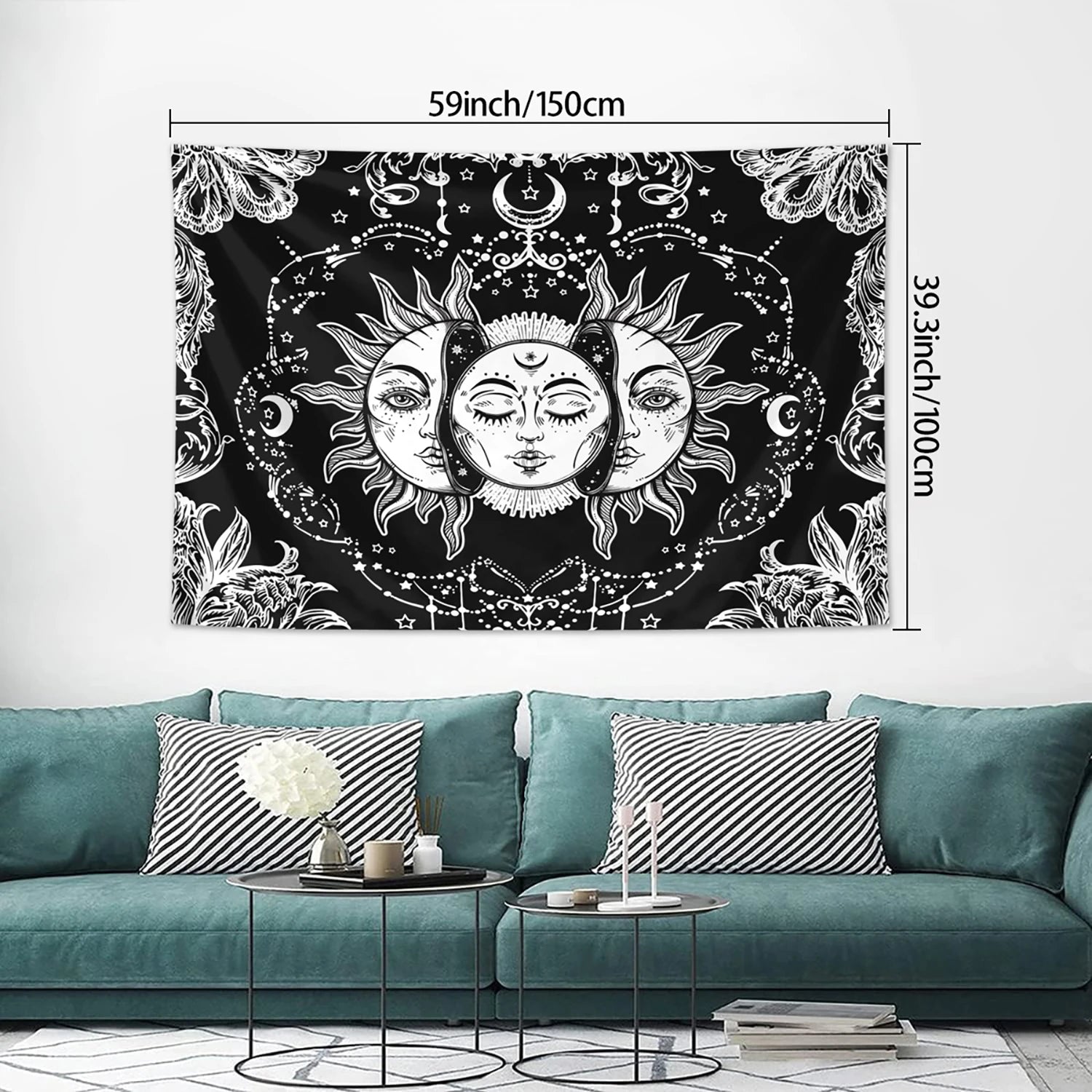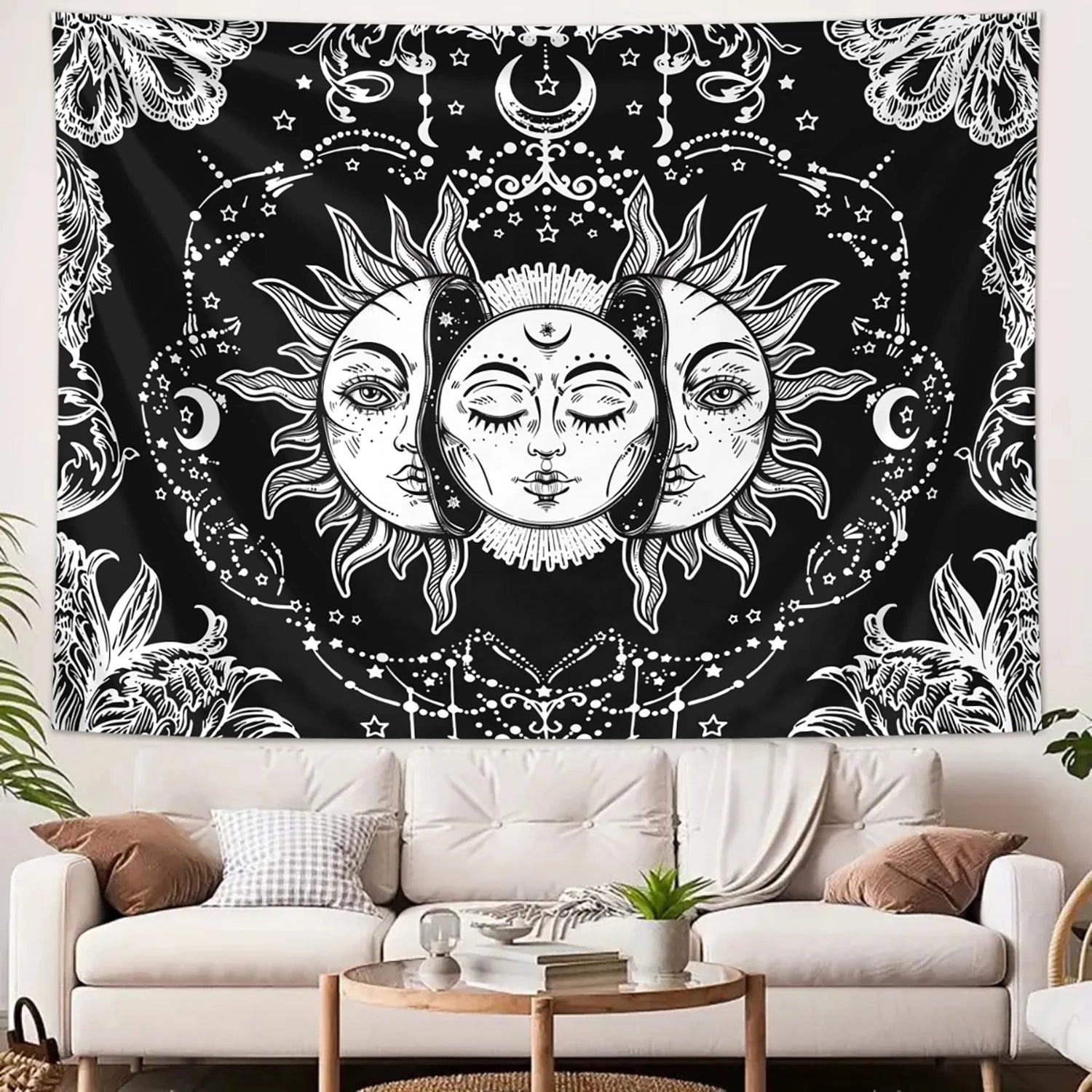This tapestry features a black and white design with mystical elements, perfect for adding a bohemian or eclectic vibe to your decor.