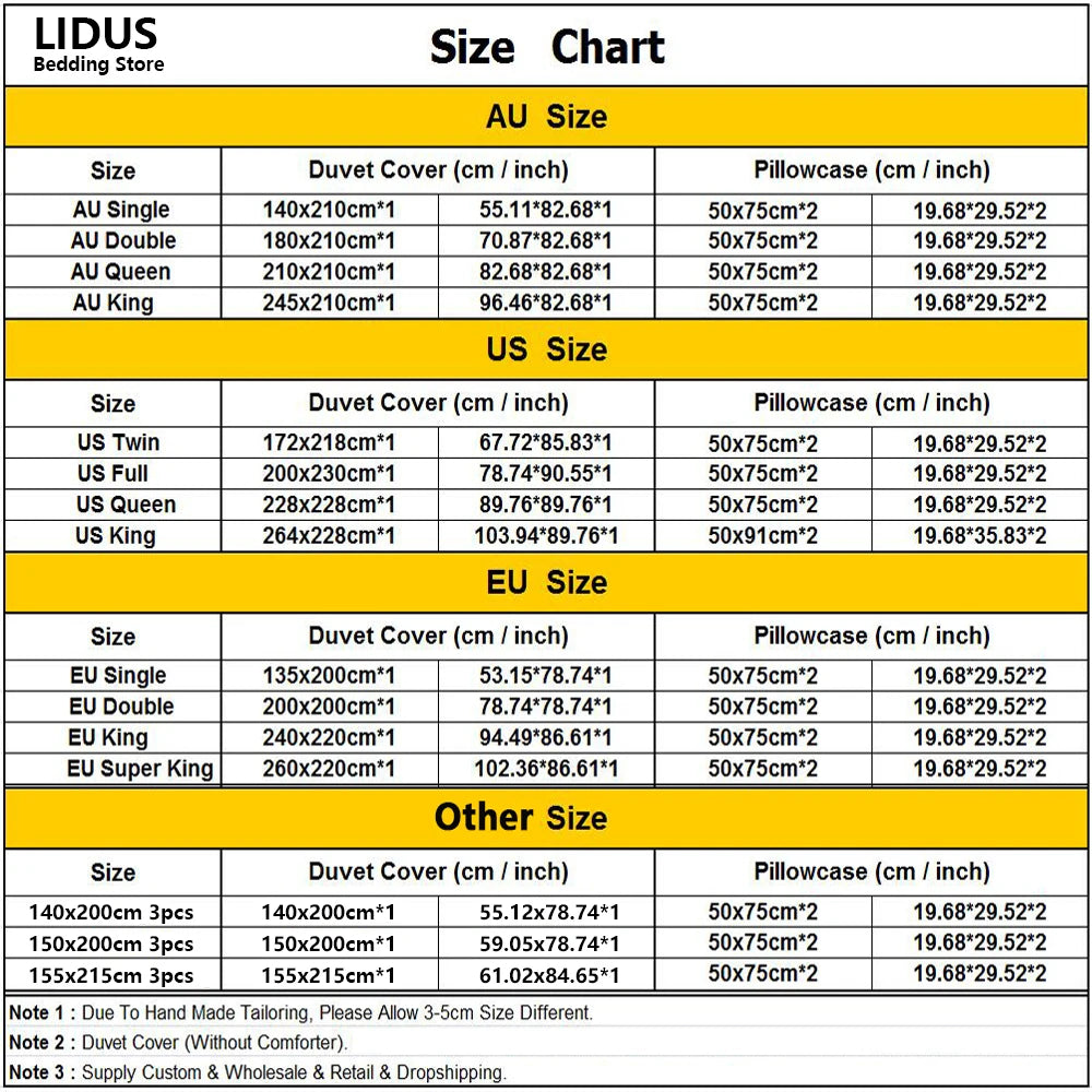 Choose from a full range of AU, US, and EU sizes including Twin, Full, Queen, King, and more. Each includes two 75cm x 50cm pillowcases. Please refer to the detailed size chart before ordering.