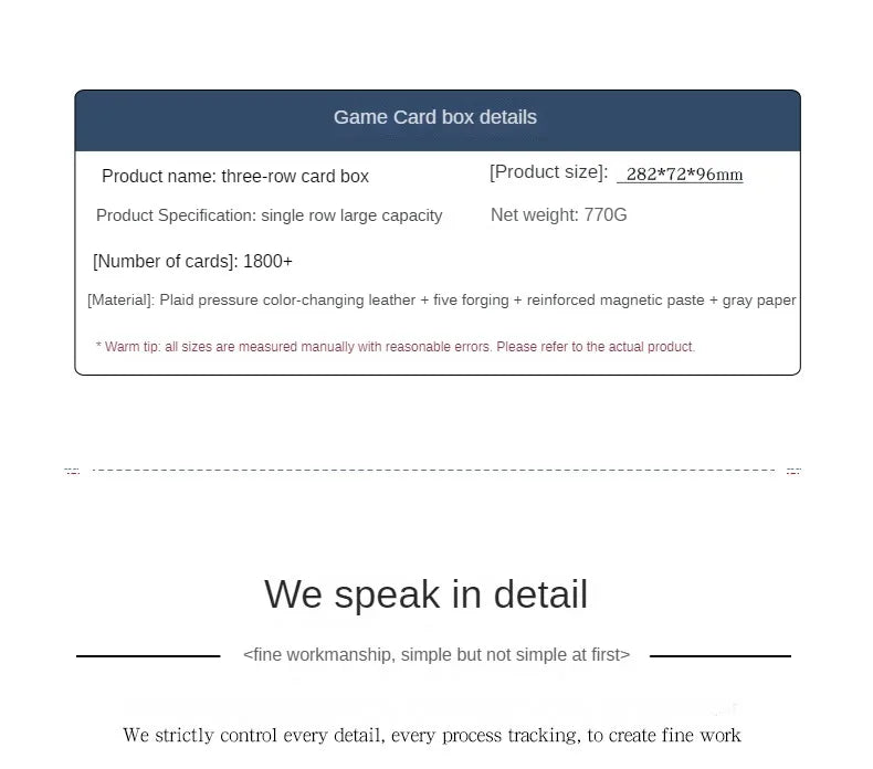 Our card storage box not only offers supreme functionality but also adds a touch of style with its sleek design. Whether you're a casual player or a dedicated collector, this box is perfect for keeping your game cards organized and protected.